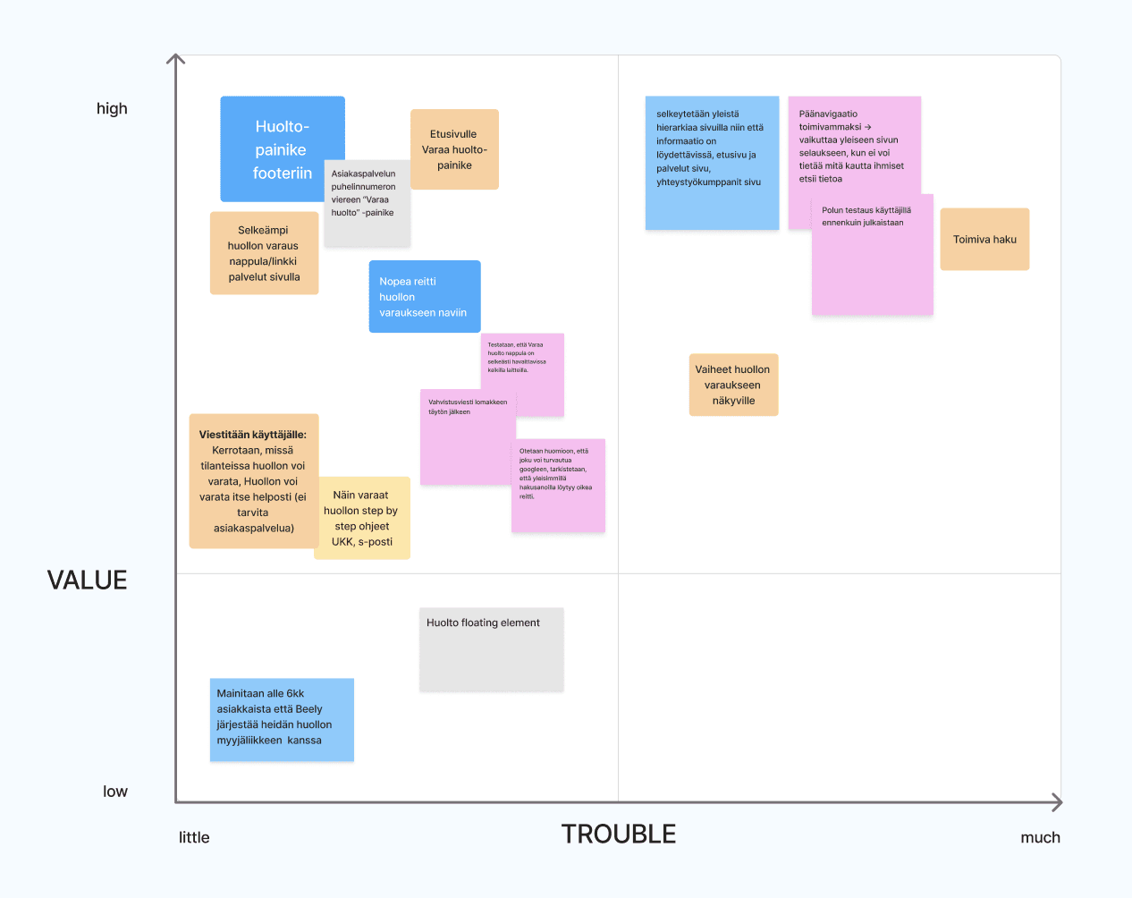 To move from insights to action, I proposed, planned and facilitated a workshop for our team. In this workshop we mapped ideas on a 2x2 matrix (impact vs. effort) to identify high-value, low-effort solutions.